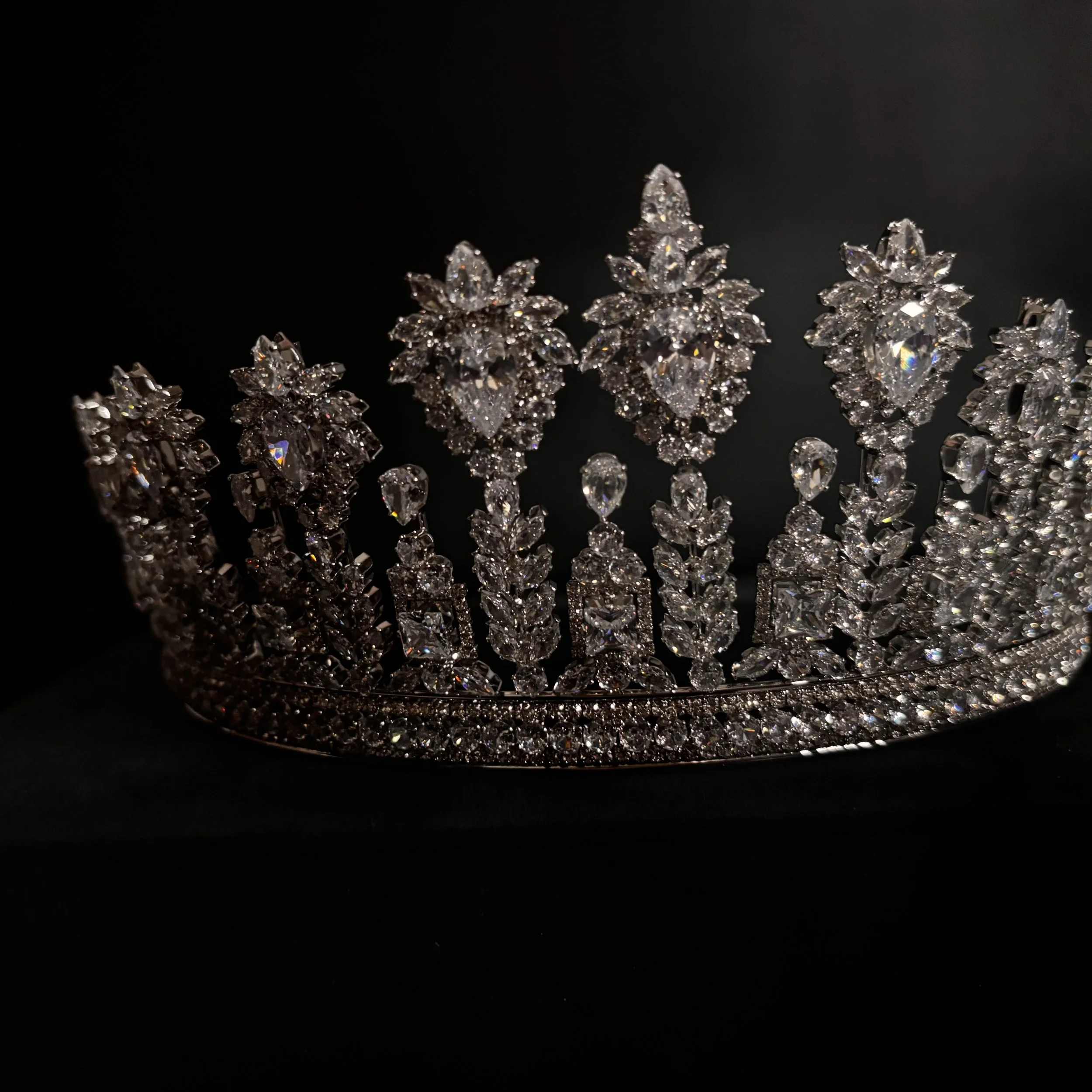 A handcrafted crown designed to catch light from every light from every angle, Perfect for the bride who wants to feel like royalty on her special day.